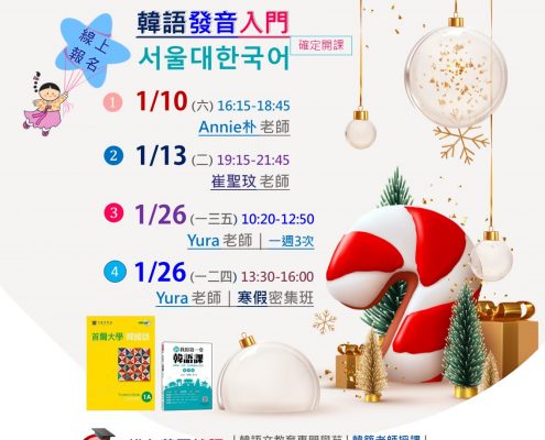 Korean2025-12-25 14:29:062025-12-25 14:29:06【1月份x 發音入門】確定開課