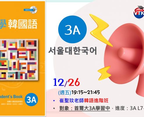【進階韓語_3A班】12/26起,每週五19:15~ (8堂/20H)