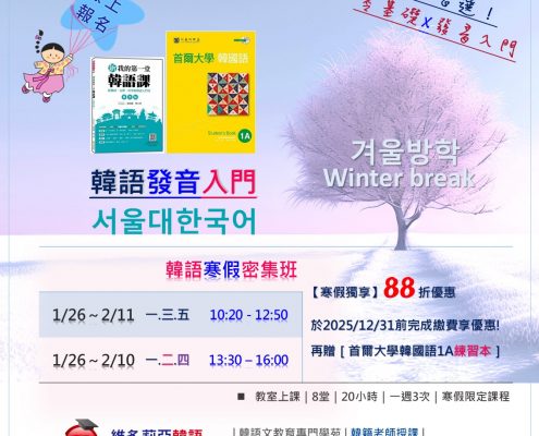 【2026寒假班】:配合20週年慶活動,於2025.12.31前完成報名繳費,享學費88折優惠,贈我的第一堂韓語課習字帖+首爾大學韓國語1A練習本。\僅次一檔/
