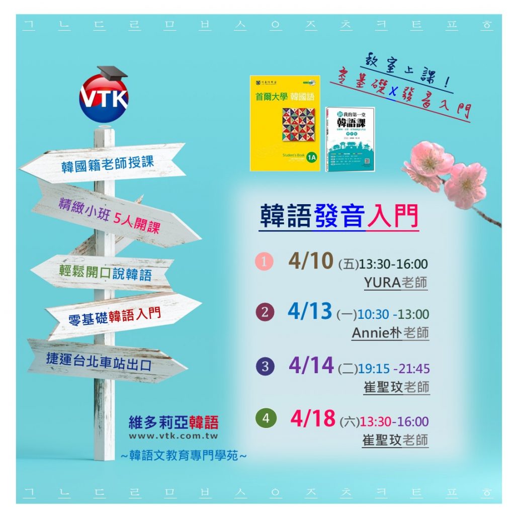 봄봄봄봄이왔네요. 🌸春春春春天來了! 快來跟著韓籍講師輕鬆開口說韓語,學完前10小時韓文字輕鬆唸出來!韓語感的培養、日常用文法學習,歡迎加入✨維多莉亞韓語,精緻小班課程,#捷運台北車站_z2出口大樓