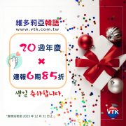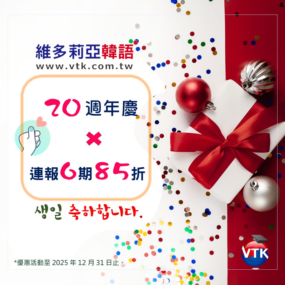維多莉亞韓語 生日快樂! 12 月 16, 2025/在: 學員活動, 最新消息 /通過: Korean歡慶20週年慶!6期85折活動 活動至2025.12.31止,最適合有長期學習規劃的同學~僅此一檔,敬請把握! ▍優惠活動,歡迎 一對一諮詢 官方LINE:lin.ee/qKUOQNg https://www.vtk.com.tw/wp-content/uploads/2025/12/6期85折.jpg 1134 1134 Korean /wp-content/uploads/2017/04/logo.png Korean2025-12-16 16:54:302025-12-16 16:57:15維多莉亞韓語 生日快樂!