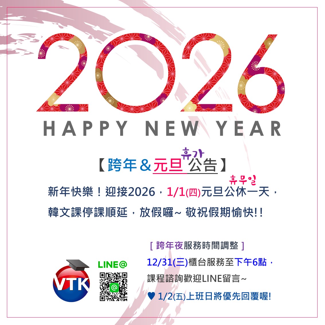 [1/1元旦休假公告]2026 新年快樂! 12 月 31, 2025/在: 學員活動, 最新消息 /通過: Korean 【跨年&元旦 公告】#元旦停課 新年快樂!2026 Happy New Year!! 1/1(四)元旦公休一天,韓文課停課直接順延,我們放假囉~ 敬祝大家假期愉快! ━━━━━━━━━━━━ [跨年夜服務時間調整] 12/31(三)櫃台服務至下午6點,課程諮詢歡迎LINE留言~ 1/2(五)上班日將優先回覆喔! ━━━━━━━━━━━━ #維多莉亞韓語 #韓語小班教學專家 https://www.vtk.com.tw/wp-content/uploads/2025/12/元旦休假公告.jpg 1134 1134 Korean /wp-content/uploads/2017/04/logo.png Korean2025-12-31 11:56:022025-12-31 11:56:02[1/1元旦休假公告]2026 新年快樂!
