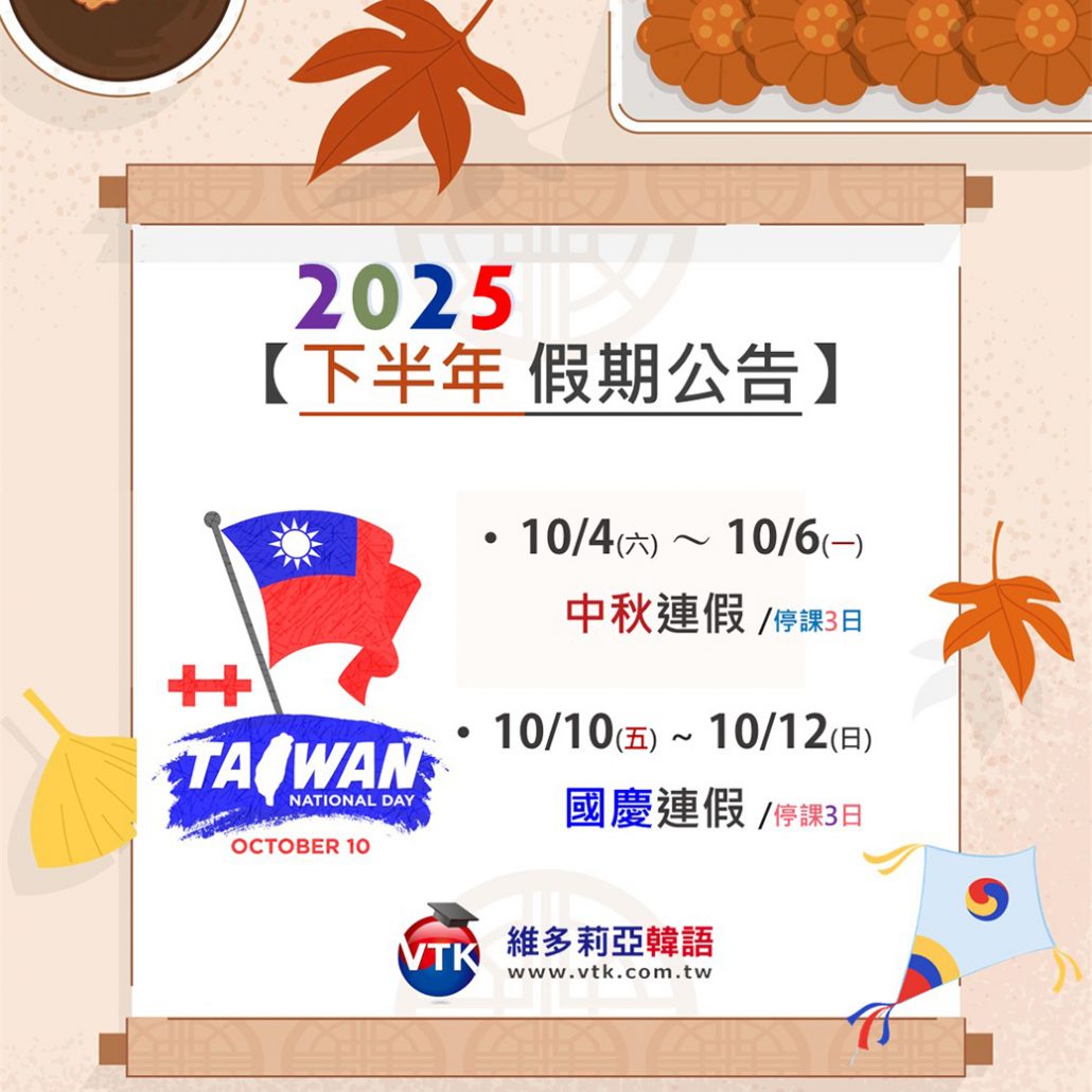 課程停課時間,請參考 維多莉亞韓語 【2025 下半年 假期公告】